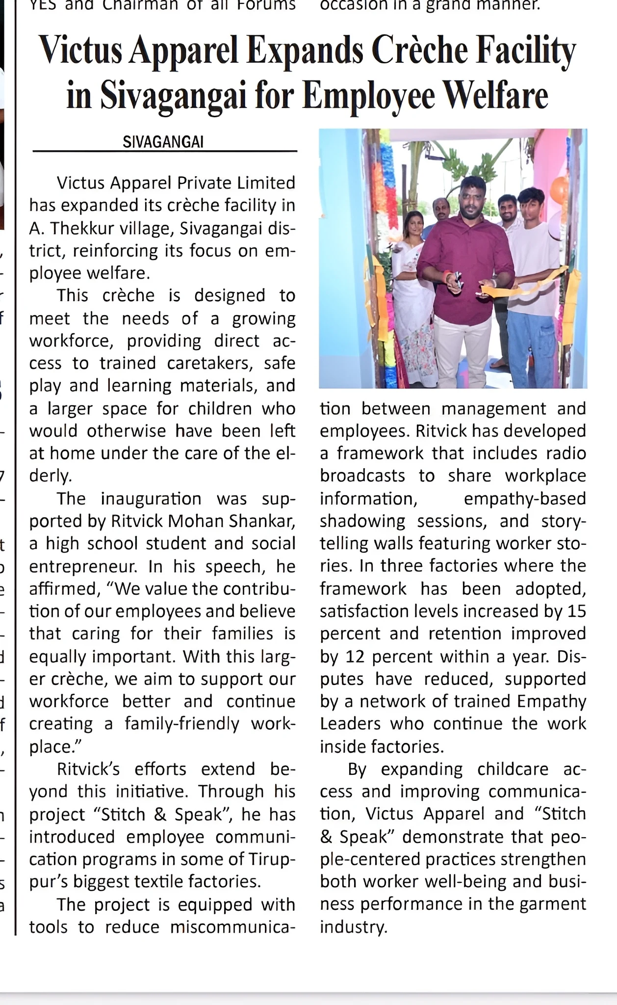 • I designed and implemented a 20-point well-being framework encompassing initiatives such as workplace crèches, grievance redressal systems, and morning exercise routines to enhance worker well-being and productivity. To ensure long-term sustainability, I trained and empowered over 20 shop-floor workers as Empathy Leaders, enabling the model to be driven internally. This initiative resulted in a 20% improvement in employee well-being and a 10% reduction in attrition. The framework has since been adopted by three factories and integrated into their HR protocols. The project was commended by the Tiruppur Exporters’ Association, endorsed by factory owners, recognized by the Labour Inspector, and featured in the media for reimagining worker voice in India’s garment sector.